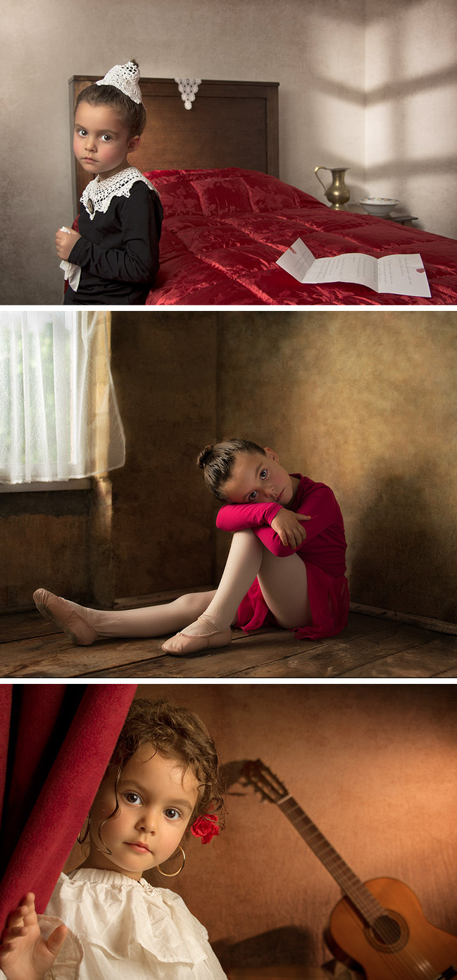 Este pai fotógrafo (Bill Gekas) retratou sua filha como personagem principal em fotos inspiradas em cenários de filmes europeus e pinturas de grandes artistas, como Caravaggio, Vermeer, Rembrandt, Raphael, Velazquez, etc.