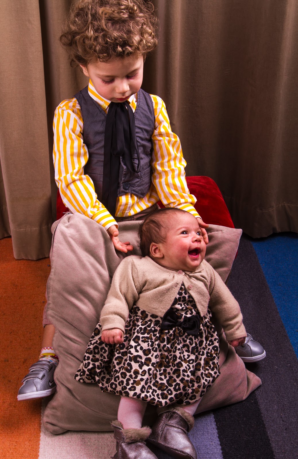 Montámos o escaparate, usando como fundo as cortinas da sala, eu e a Matita “produzimo-nos em tigresse“ e vesti o Afonso com um look condizente e numa onda mini-western-fashion-baby-boy. ;)
